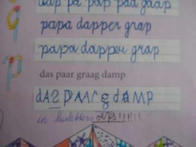 - duidelijke en functionele lettervormgevingskennis: vertel over de vormgeving van de letters; het onderscheid tussen rechte en gebogen lijndelen, wáár letter uit- en invoegen en wat de verhoudingen zijn, zowel van de breedte-/hoogte als van de letterdelen onderling.
